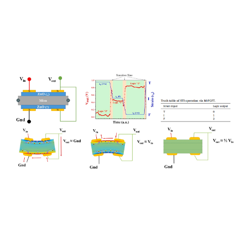 本專利提出多維壓電閘控柔性電晶體感測器,於雲母基板上下兩側成長 氧化鋅半導體薄膜,低功耗即可分辨正/負彎曲與壓縮載重,並可延伸為三值邏輯元件。適用於 IoT 智慧結構監測、機器人觸覺、可穿戴與車用安全感測。本技術以單一元件即可分辨正彎、負彎與壓縮,並可分離量化各向應變;其上下端在彎曲下呈現不對稱 GF、壓縮下呈對稱 GF,形成可識別載入型態的獨特指紋。更進一步把感測訊號直接轉為三值邏輯(NOT、NAND),兼具低功耗感測與運算,優於僅能量測且難以判別應變型態的既有設計。