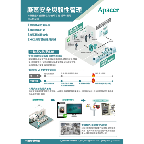 客製規劃多種解決方案,利用AI辨識技術及感測器偵測,落實 安全防護智慧化,從過去僅能被動事後通報,走向事前預警, 並能即時執行斷電、斷瓦斯等措施